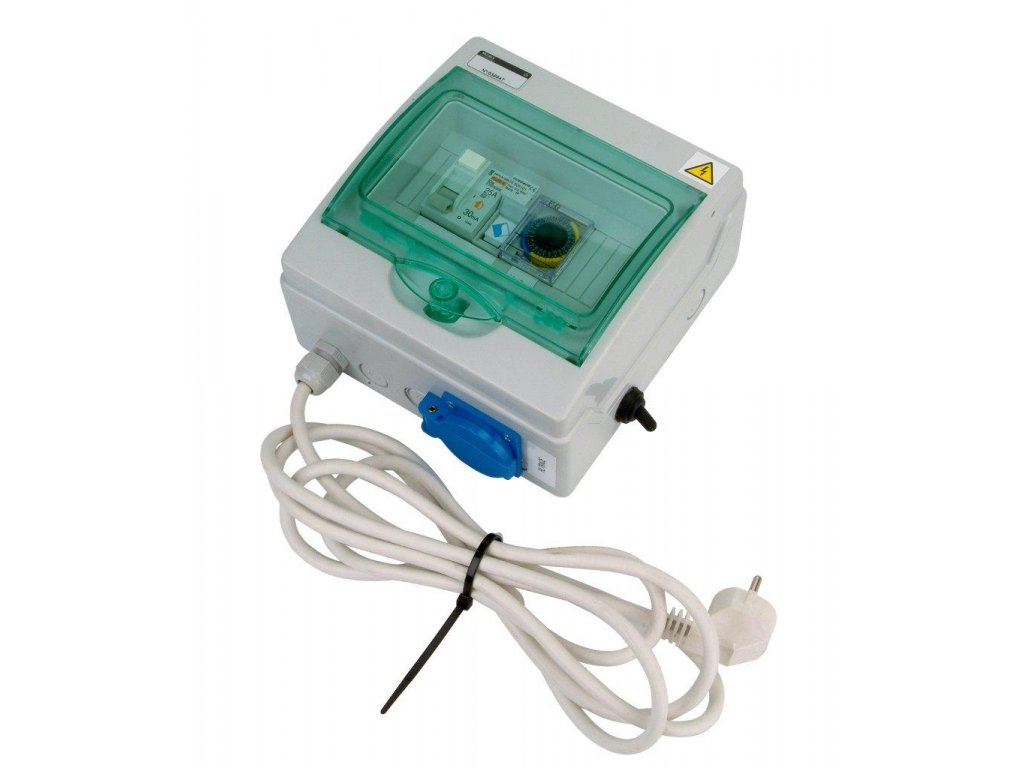 Automatické ovládání F1 s flexo-kabelem - jednoduchá montáž, bez zásahu do vnitřního zapojení. Připojíte pouze zástrčku filtrace do zásuvky a zástrčku automatiky do zásuvky přivedené pro bazén. Automatika je vybavena proudovým chráničem 30 mA, jištěním motoru filtrace, spínacími hodinami pro časové spínaní doby filtrování. Na boku rozvaděče je přepínač pro okamžité zapnutí filtrování, například při vysávaní.
